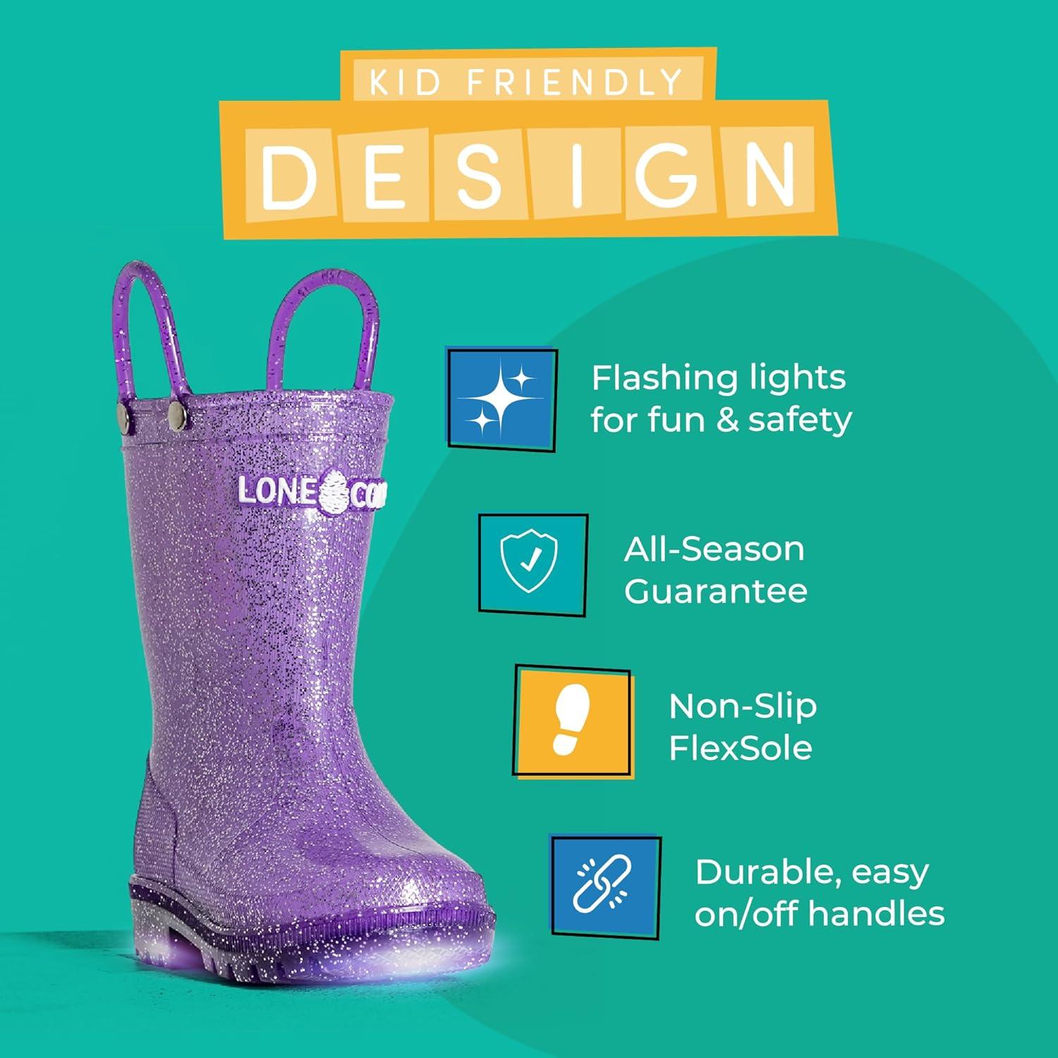 Lone Cone Kids Rain Boots for Girls & Boys – Waterproof Natural Rubber Toddler Rain Boots with Non-Slip Outsole & Easy Pull Handles – Solid, Pattern & Glitter Designs(33 – Purple Nova – Glitter | Light-up)